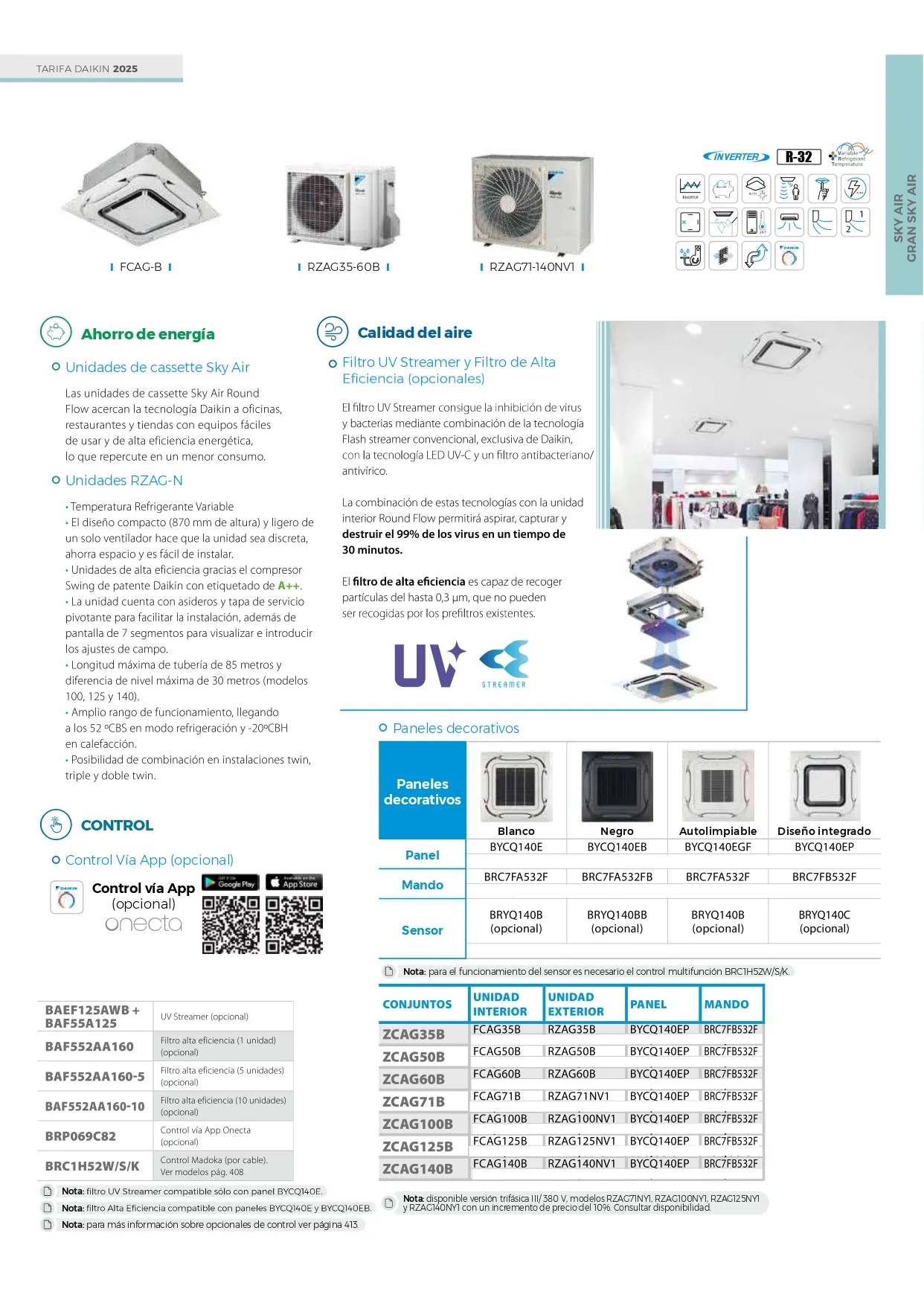 Adicionalmente, el sistema es compatible con accesorios opcionales como el filtro UV Streamer para la inhibición de virus y bacterias, filtros de alta eficiencia capaces de capturar partículas de hasta 0,3 μm, el sensor de presencia y temperatura para un ahorro de hasta el 27% de energía, y los mandos de control Madoka con diseño premium en diferentes acabados.